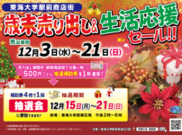 東海大学駅前商店会では 2025年12月3日(水)から12月21日(日)まで 歳末売り出し&生活応援セール!! を開催します! ●売り出し期間中、東海大学駅前商店街のお店で お買い物500円ごとに補助券を1枚進呈! ●補助券4枚で抽選会に1回参加できます!(空くじなし) 売出期間 12月3日(水)~21日(日) 抽選日時 12月15日(月)~21日(日) 各日 午後2:00~6:00 抽選会場 東海大学前駅 イベント広場 賞品 ★特賞 IHジャー炊飯器 ★ ...